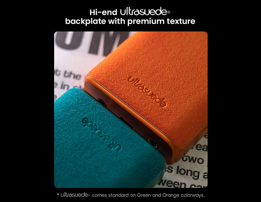 The R3 Pro II combines a robust aluminum alloy frame with premium backplates—Ultrasuede® on green and orange models for a soft, grippy, temperature-stable feel, and matte glass on black and silver variants to resist fingerprints and scratches, ensuring a durable, elegant design for daily use.