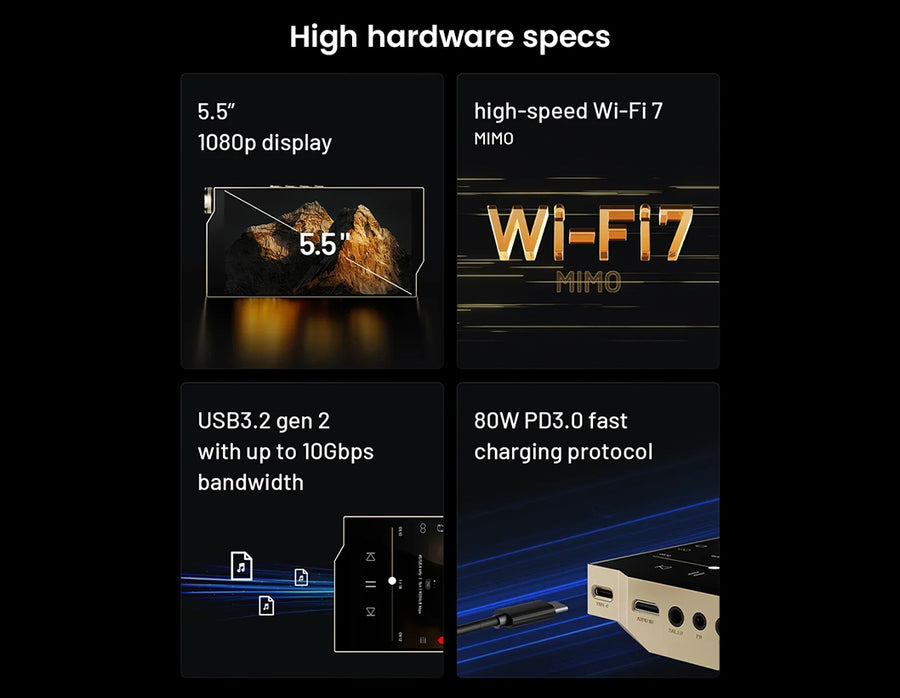 The pioneering Sankofa AI sound cloning technology uses FPGA, NPU, and DSP arrays to recreate authentic analog tonalities from classic sources in real time. The RS8II also introduces I2S connectivity for enhanced integration and versatile output options. Its robust and lightweight build combines a one-piece aluminum alloy body with a glass back, accented by a diamond-cut volume knob and geometric design. The player also supports DSD1024, PCM up to 1536kHz/32bit, MQA 16x, true bit-perfect playback, Bluetooth 5.3, Wi-Fi 7 and fast 80W PD charging, making it a comprehensive ultra-flagship portable hi-fi solution.