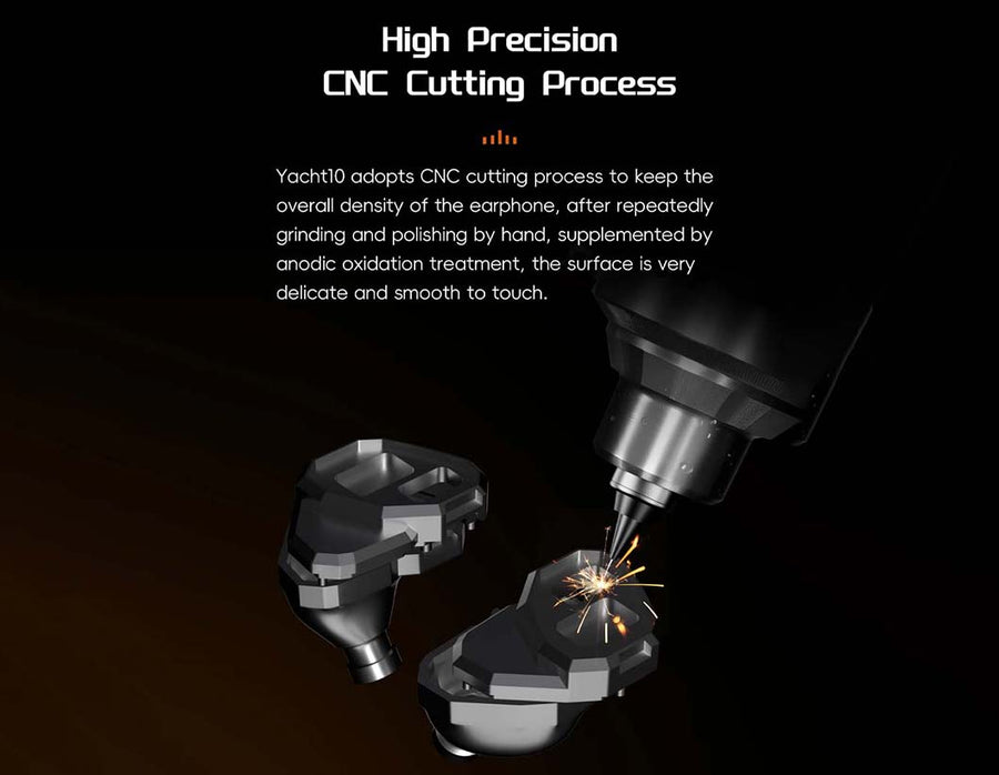 HiBy Yacht10 is the first in-ear monitor (IEM) designed under the theme of "Voyage & Discovery" combining an armored-like casing with ergonomic comfort. It features a newly crafted 10mm magnesium-aluminum dome with low-distortion speakers, ensuring rich detail and dynamic performance. The Yacht IEM series explores the tonal characteristics of different drivers, allowing listeners to experience the harmony between the earphone's sound and the expression of music. Additionally, the optimized drivers and acoustic structure offer a diverse and immersive listening experience, highlighting the beauty of solo-speakers.