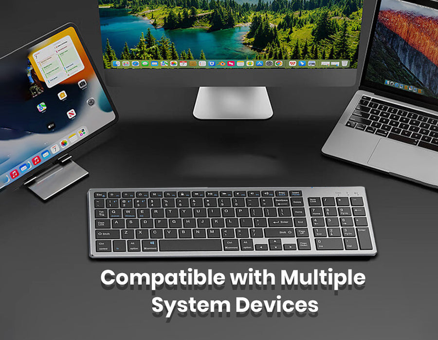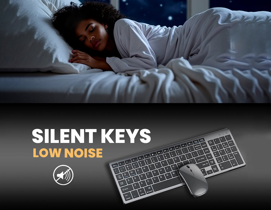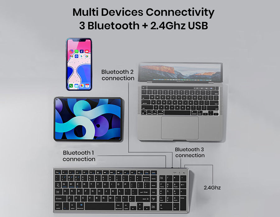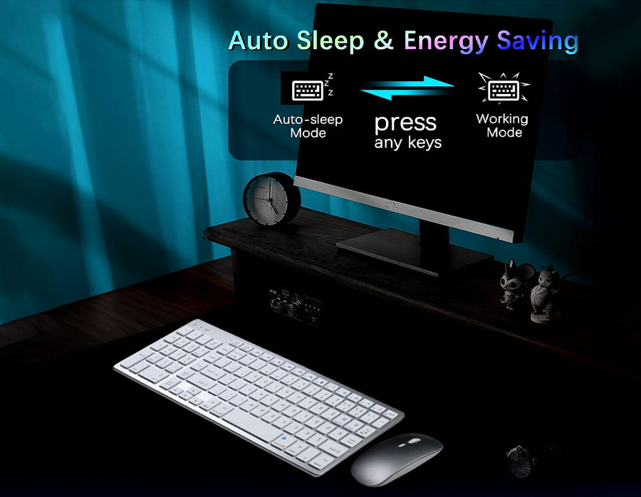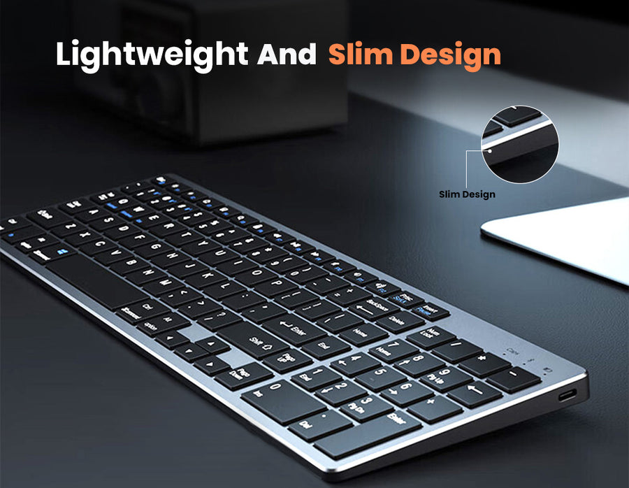 This wireless keyboard and mouse combo, designed for maximum convenience and efficiency. The keyboard supports stable connections with up to three Bluetooth devices and one USB device simultaneously, allowing effortless switching with a simple button press. The mouse connects to two devices via Bluetooth and USB, ensuring smooth multitasking. With unmatched compatibility for Windows, macOS, Android, and iOS, it connects effortlessly to laptops, tablets, PCs, and smartphones. Its portable, lightweight design makes it ideal for travel or home use. The rechargeable keyboard, powered by a 300mAh lithium battery, offers up to 180 hours of standby time and features a Type-C charging port and auto-sleep mode. The thin, silent design ensures quiet, fatigue-free operation, perfect for extended work sessions.