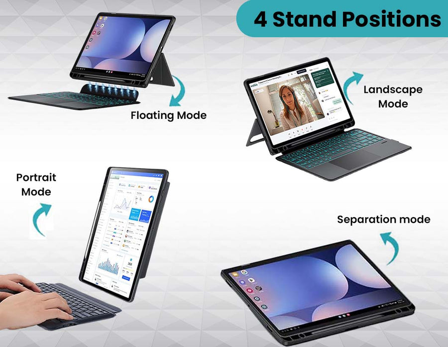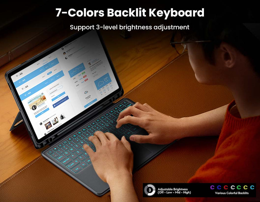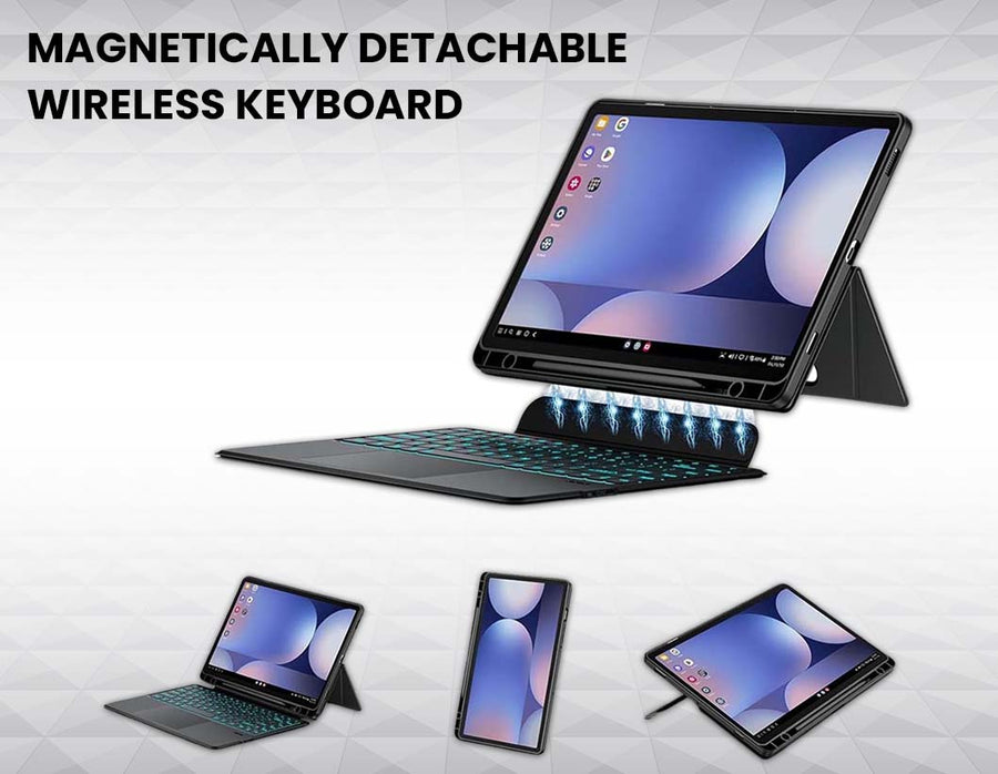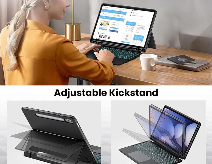 The Keyboard case is only compatible with Samsung Galaxy Tab S10 Ultra 2024 (Model: SM-X920, SM-X926B, SM-X926N, SM-X920N), Samsung Galaxy Tab S9 Ultra 2023 (Model: SM-X910, SM-X916B, SM-X918U), Samsung Galaxy Tab S8 Ultra 2022 (Model: SM-X900, SM-X906, SM-X906B, SM-X906U, SM-X906N) 11.4 inch. Confirm your tablet model before purchasing (Tablet and S Pen not included). Protective folio case comes with wireless detectable keyboard, smart gesture trackpad, 7 color backlit. The portable design and adjustable kickstand allow for versatile viewing angles, while premium leather provides ultimate protection. Enjoy easy access to ports and buttons with precise cutouts, and a built-in Pen holder keeps your stylus secure. The Bluetooth keyboard ensures quiet, responsive typing and includes an auto sleep/wake function for energy efficiency.