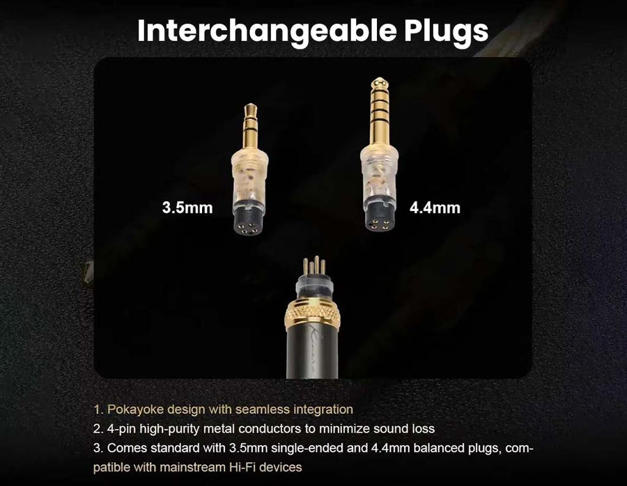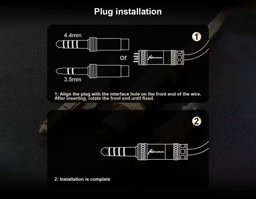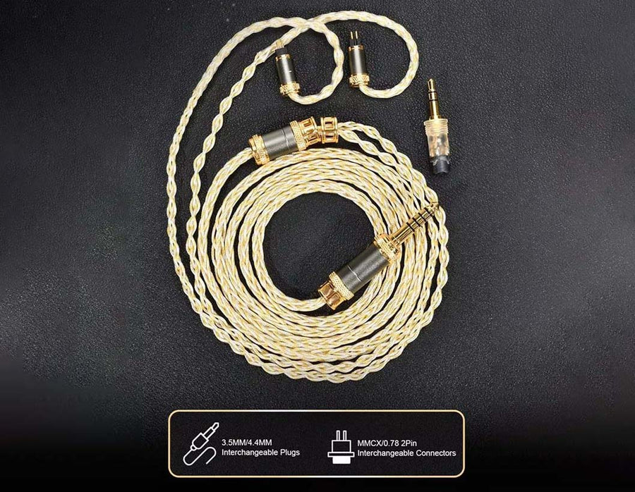The Kinera MIA upgrade cable features high-purity 8-core 6N Single Crystal Silver-plated Copper with 49-strand conductors per core, enhancing sound clarity and transmission efficiency. Its copper-silver blend delivers deep bass, crisp highs, and an expansive soundstage. Interchangeable 3.5mm and 4.4mm plugs with secure threaded locking ensure versatile Hi-Fi compatibility, while 0.78mm 2-pin and MMCX connectors provide a stable fit for various IEMs. CNC-machined gold-plated brass components optimize durability and audio performance, while the soft PVC outer layer minimizes noise for an immersive experience.