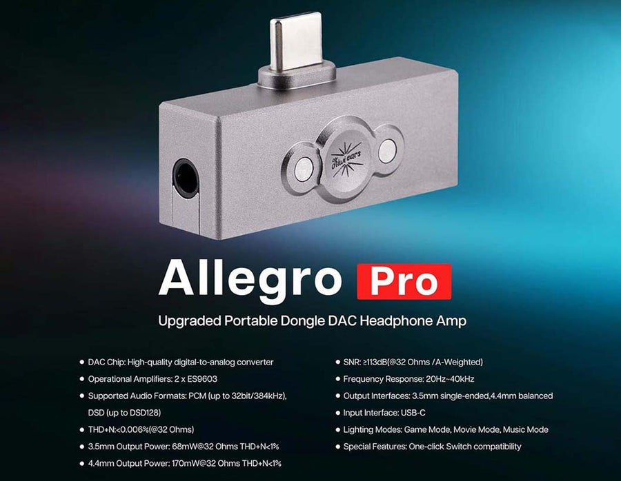 The Kiwi Ears Allegro Pro is a cutting-edge, portable DAC/AMP designed for audiophiles, gamers, and music enthusiasts. Building upon its predecessor, the Allegro Mini, it offers significant upgrades in performance and features. Encased in a sleek, all-metal enclosure, the Allegro Pro combines a custom high-performance DAC chip with dual ES9603 operational amplifiers, delivering clean, detailed sound with a slightly brighter timbre. It supports high-resolution audio formats like PCM up to 32-bit/384kHz and DSD up to DSD128, making it versatile for various audio applications. Its compact design and seamless USB-C connectivity with smartphones, laptops, and other devices ensure high-quality audio on the go, catering to both critical music listening and immersive gaming experiences.