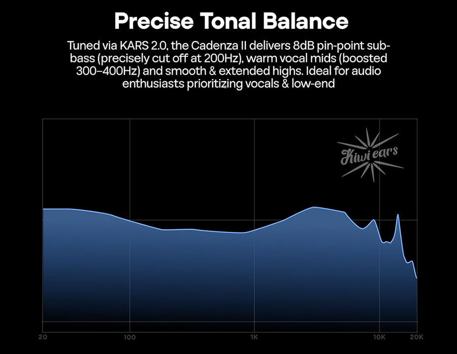 The Kiwi Ears Cadenza II is a high-performance in-ear monitor featuring a 10mm titanium-coated PET dynamic driver for punchy sub-bass and exceptional transient response. Tuned with the KARS 2.0 acoustic resonance system, it delivers warm, forward vocals and a smooth, non-fatiguing treble that is ideal for pop and acoustic genres.