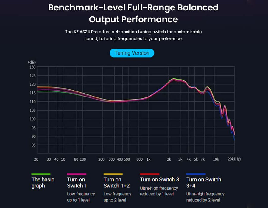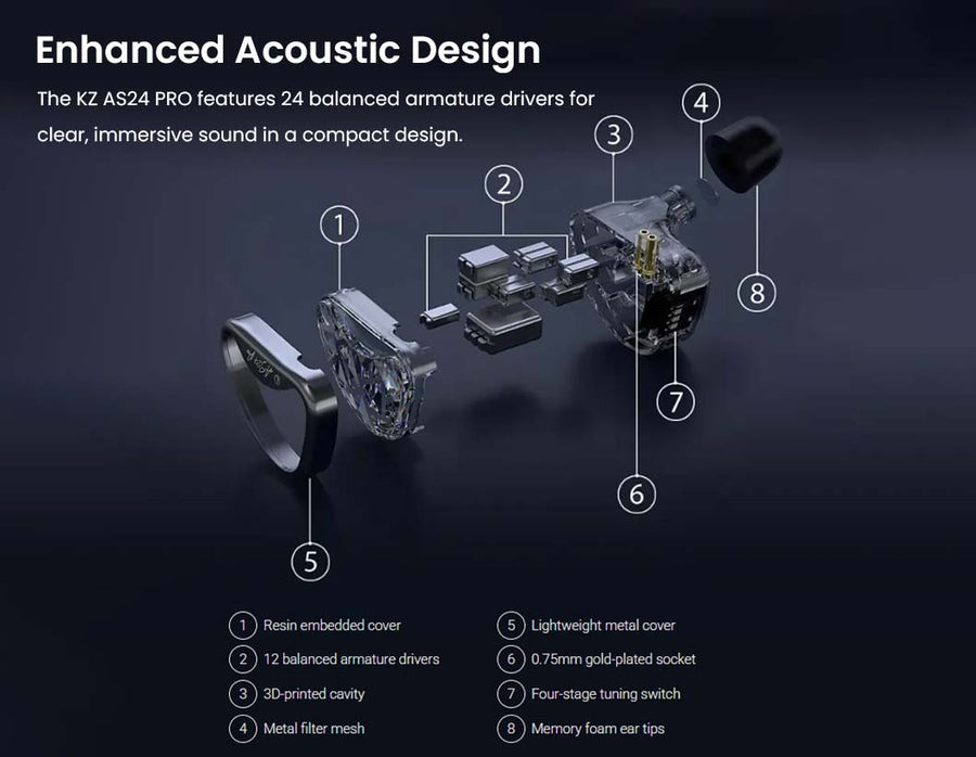 KZ AS24 Pro in ear monitors sets a new benchmark in Hi-Fi audio performance, offering an unmatched listening experience. This IEM delivers amazing sound quality with its 24 balanced armature drivers, offering precise highs, natural mids, and deep bass. Its four-stage tuning switch and electronic filter technology allow for customizable and distortion-free sound. The DLP 3D-printed housing ensures precision and clarity, while the ergonomic design and silver-plated cable enhance comfort and durability. With sustainable packaging and thoughtful accessories, the AS24 Pro IEM combines luxury, performance, and value for an exceptional listening experience.