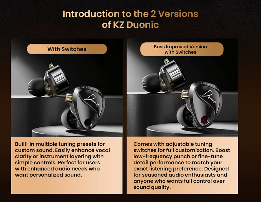 The KZ Duonic is a groundbreaking In-Ear Monitor that fuses the industry-First Three- Planar Magnetic Driver with a Super-Linear Dynamic Driver to deliver an exceptional audio experience. This advanced hybrid setup is engineered for both stunning clarity in music and precise sound positioning in competitive gaming. The KZ Duonic is offered in various versions to suit different user preferences. The "No Switches" and "Bass Improved Version with Switches" models feature pre-calibrated with optimized HM setup and 4-Level Customizable Tuning for personalized sound respectively. For users seeking versatile connectivity, the IEM is available with a standard 3.5mm termination or an optional USB Type-C DSP Version, which features selectable audio modes like Bass Boost and Immersive Gaming Mode.