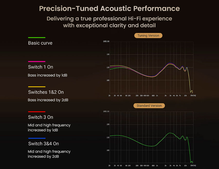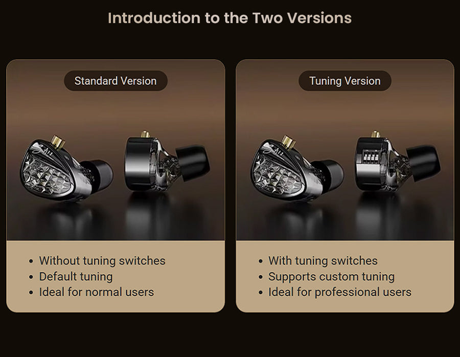 The KZ ZA12 In-Ear Monitor is available in two versions to suit different users. The Standard Version comes without tuning switches, offering a well-balanced sound, perfect for everyday listeners. The Tuning Version in ear monitor features adjustable switches, allowing for custom sound tuning, making it ideal for professional users and audiophiles. Designed for musicians, singers, band and worship teams, streamers, gamers, and sound engineers, the ZA12 in ear monitor delivers high-quality audio tailored to various needs. The in ear monitor is suitable for a wide range of users, from casual music enthusiasts to professional musicians and audio engineers. Its customizable sound signature and high-quality audio reproduction make it an excellent choice for studio monitoring, live performances, and critical listening.
