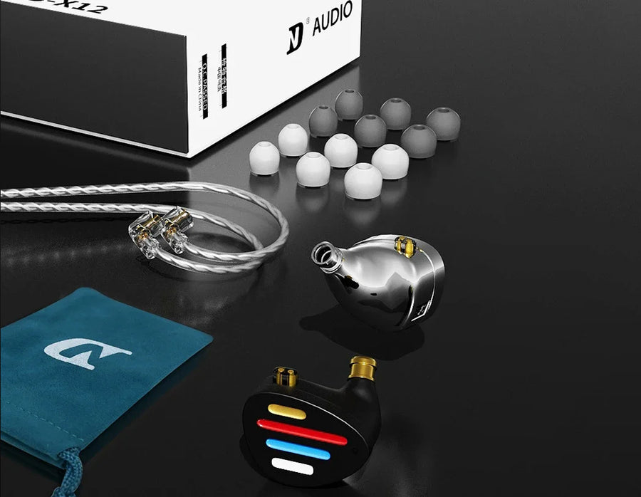 The ND X12 1DD + 5BA Hybrid IEM is a flagship in-ear monitor that combines advanced driver technology with customizable sound options. It features a hybrid configuration of one 10mm dynamic driver and five balanced armature drivers per side, delivering exceptional audio across the entire frequency spectrum. The X12 stands out with its three adjustable tuning switches, allowing users to personalize their listening experience. Housed in a durable CNC pure aluminium alloy shell with a carefully engineered vent hole design, the IEM offers superior sound isolation and an immersive sound field matrix. Its ergonomic design ensures a comfortable, secure fit for extended listening sessions. With a detachable OFC cable, 2-pin connector, and 3.5mm plug, the ND X12 provides versatile connectivity options, making it an ideal choice for audiophiles seeking premium sound quality and customization in their in-ear monitors.