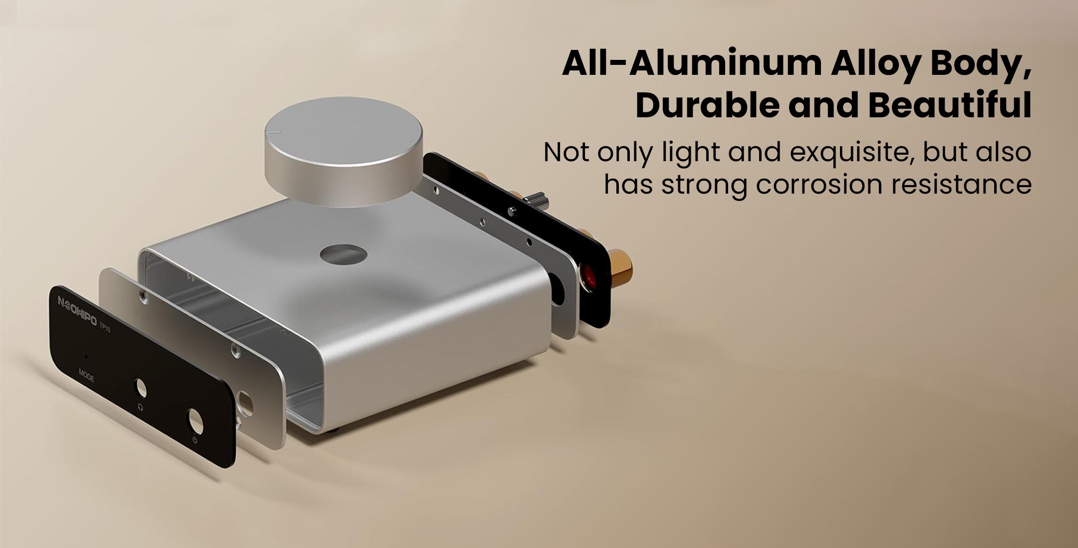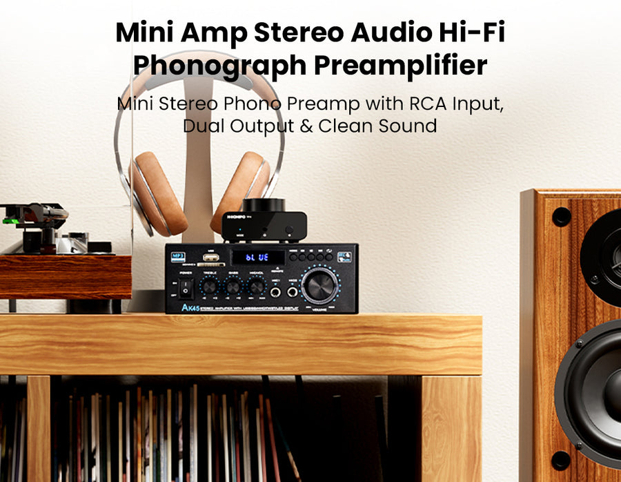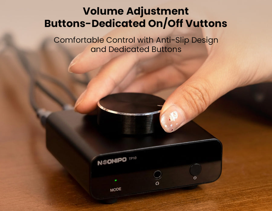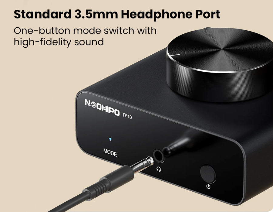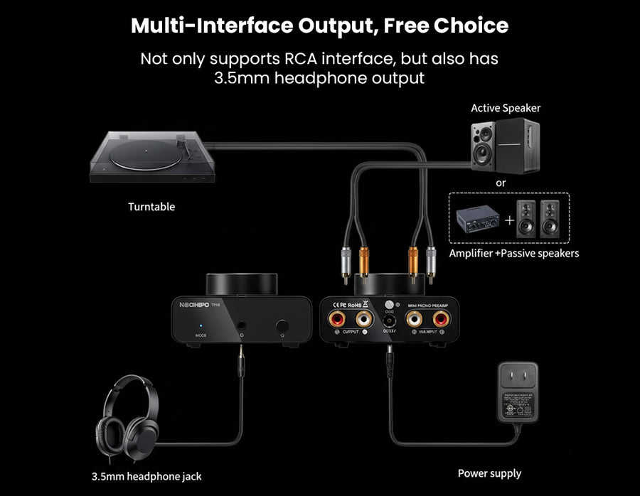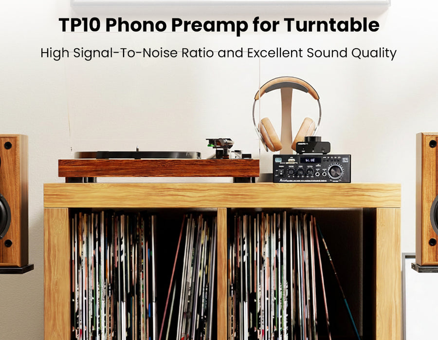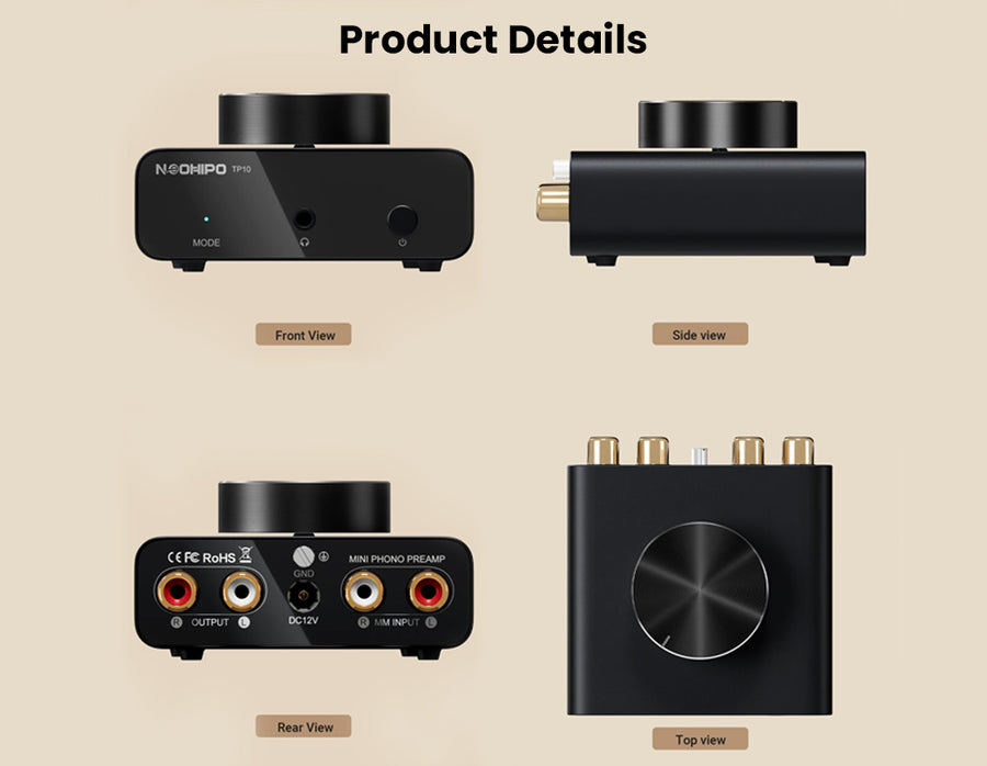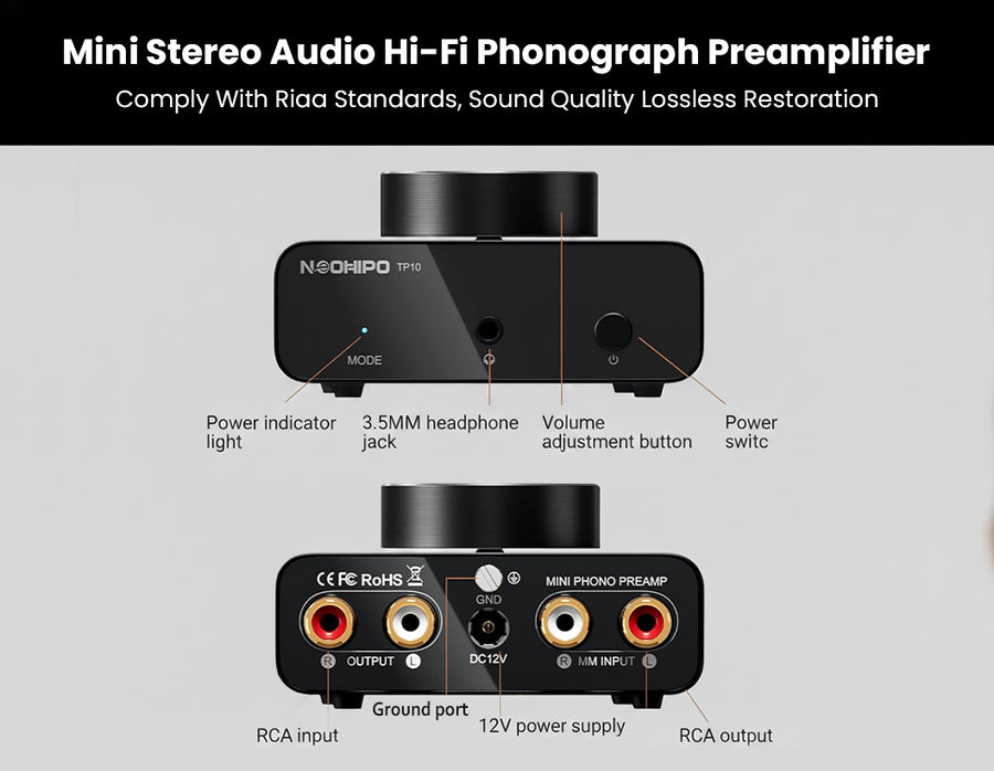 The Neohipo TP10 is a compact, high-fidelity phono preamplifier designed for vinyl enthusiasts who demand pristine audio clarity and versatility. Engineered with precise RIAA equalization and a high Signal-to-Noise Ratio (≥89dB), it effortlessly converts weak phono signals from Moving Magnet (MM) cartridges into rich, distortion-free line-level audio. Unlike standard preamps, the TP10 doubles as a dedicated headphone amplifier, featuring both RCA outputs and a 3.5mm headphone jack for seamless connection to active speakers or private listening sessions. Its premium, CNC-machined aluminum alloy chassis provides superior shielding against interference, while the smooth top-mounted volume knob offers precise gain control. With ultra-low noise circuitry and a dedicated ground post to eliminate hum, the TP10 delivers a "black" silent background, making it the perfect upgrade for any high-performance desktop or home Hi-Fi setup.