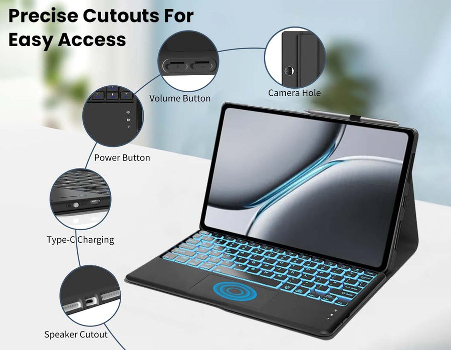 The keyboard case is widely compatible with OnePlus Pad 2 12.1 inch (2024), OnePlus Pad Pro 12.1 inch (2024) Model OPD2404, Oppo Pad 3 Pro 12.1 inch (2024) Model OPD2401. The protective case tri-fold folio cover offers built-in pencil holder and precise cutouts for seamless access to ports and controls. Featuring a multi-gesture trackpad, 7-color backlit keys, and an LED indicator, it enhances your productivity. The magnetically detachable Bluetooth keyboard supports multiple devices, while adjustable viewing angles and auto sleep/wake function optimize your experience. the keyboard case for OnePlus Pad 2 is shockproof, portable design includes Type-C fast charging for convenience on the go. Please verify your tablet model number “OP-Xxxx” in your tablet settings to ensure a perfect fit. Note; It is not compatible with other tablets. (Tablet and Styles Pen not included).