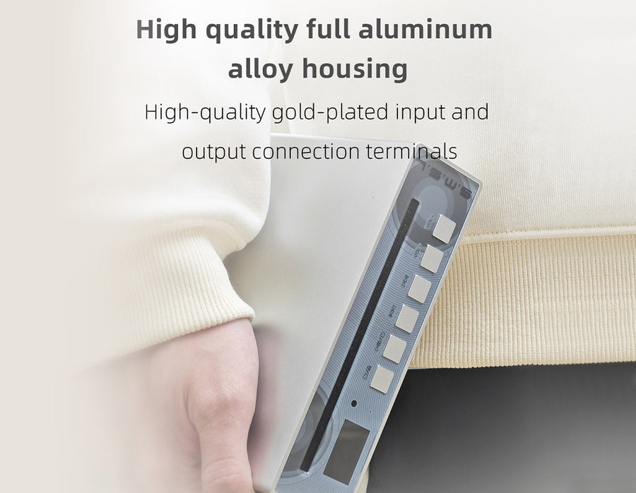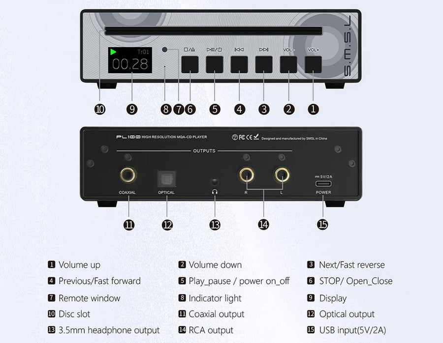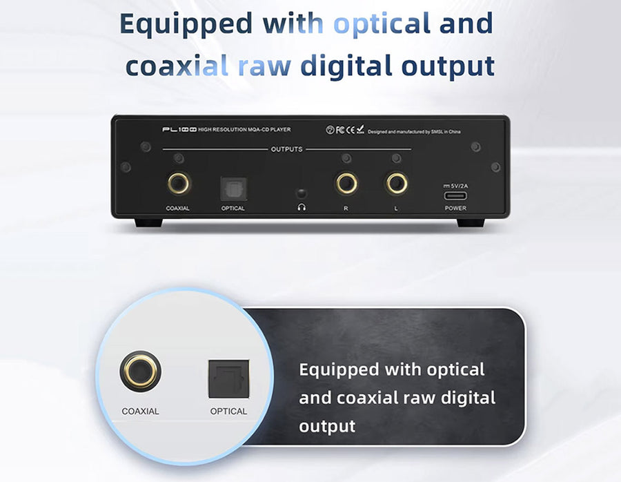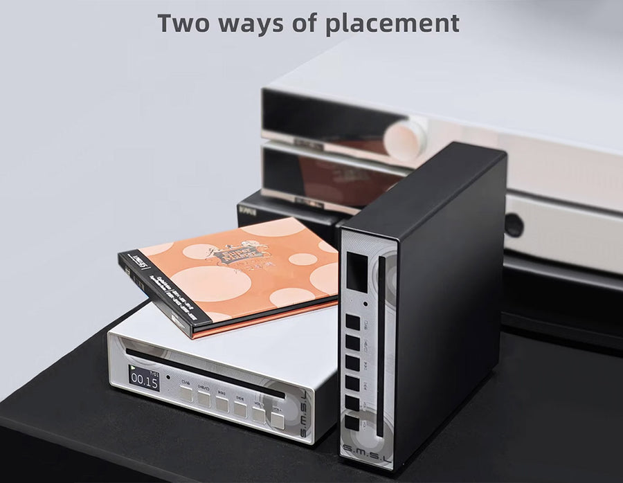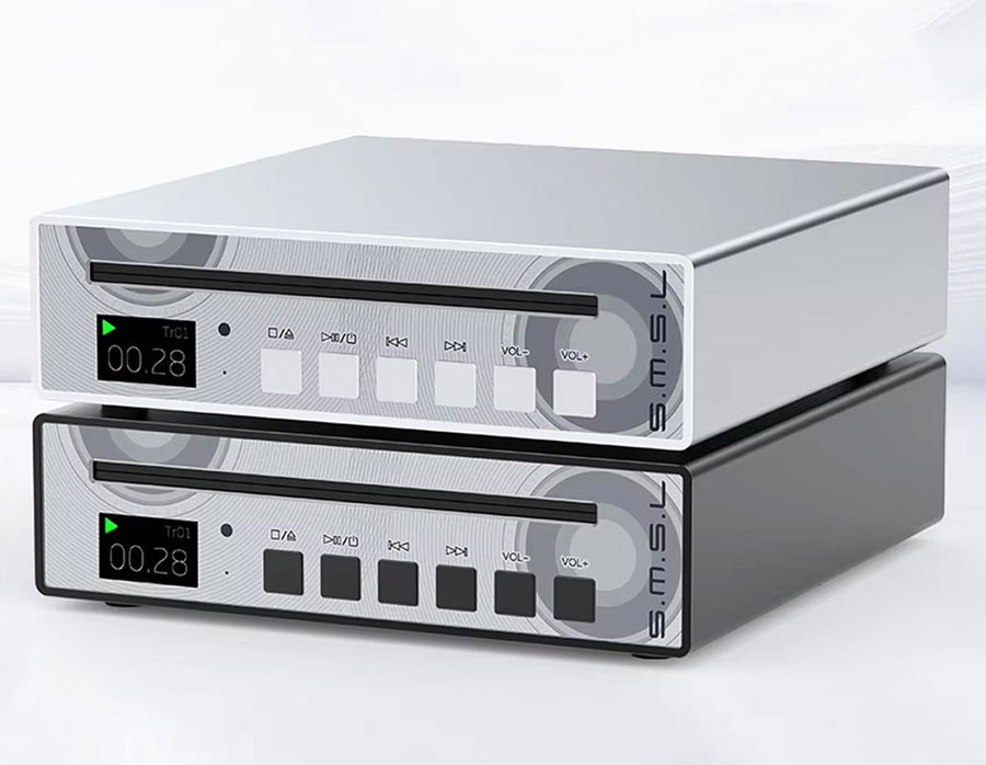The SMSL PL100 CD Player boasts a sleek, modern design with a precision-machined all-aluminum chassis that enhances both aesthetics and durability. Its clean lines and compact footprint make it a stylish addition to any audio setup. Inside, it features a premium Philips slot-in mechanism and a high-performance Cirrus Logic CS43131 DAC for ultra-clear, low-distortion audio. A second-gen PLL circuit reduces jitter for smoother playback. With optical and coaxial outputs, it supports external DACs like the SMSL SU-1 with MQA. A built-in 60mW headphone amp delivers powerful sound via a 3.5mm jack, while gold-plated connectors and a full-function remote round out this high-performing, versatile player.
