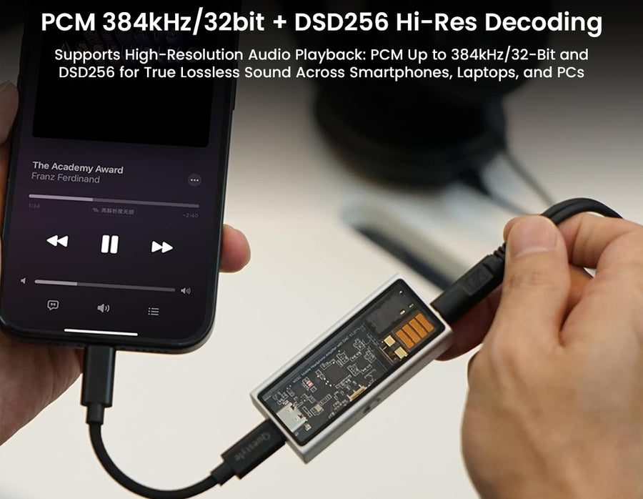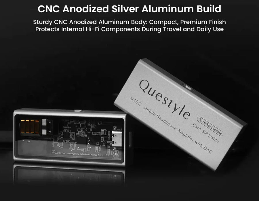 The QUESTYLE M15C DAC/AMP is a Cirrus Logic CS43198 flagship portable USB DAC/headphone amplifier that unlocks PCM 384kHz/32-bit + DSD256 hi-res lossless audio from codec-limited smartphones, tablets, laptops, and PCs. Its ultra-compact CNC anodized silver aluminum design (61.9x27.9x12mm) disappears into daily use while delivering patented 4x CMA SiP modules with 0.00028% THD+N, 1MHz bandwidth, and 42.79mW@300Ω balanced power—eliminating distortion, overheating, and battery drain even during extended hi-fi sessions. Plug-and-play across iOS, HarmonyOS, Android 5.1+, Mac, and Windows 10+ with no drivers needed, featuring 3.5mm/4.4mm dual outputs, manual gain control, and a smart LED sampling display for effortless optimization with sensitive IEMs, planars, and demanding headphones. The premium silver finish with TOREX power management and included USB-C cables protects the circuitry through travel and commutes, transforming any smart device into a serious hi-fi audio transport.