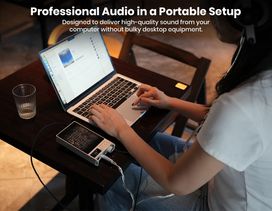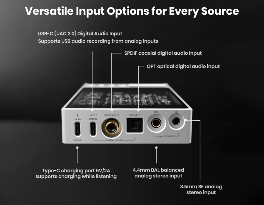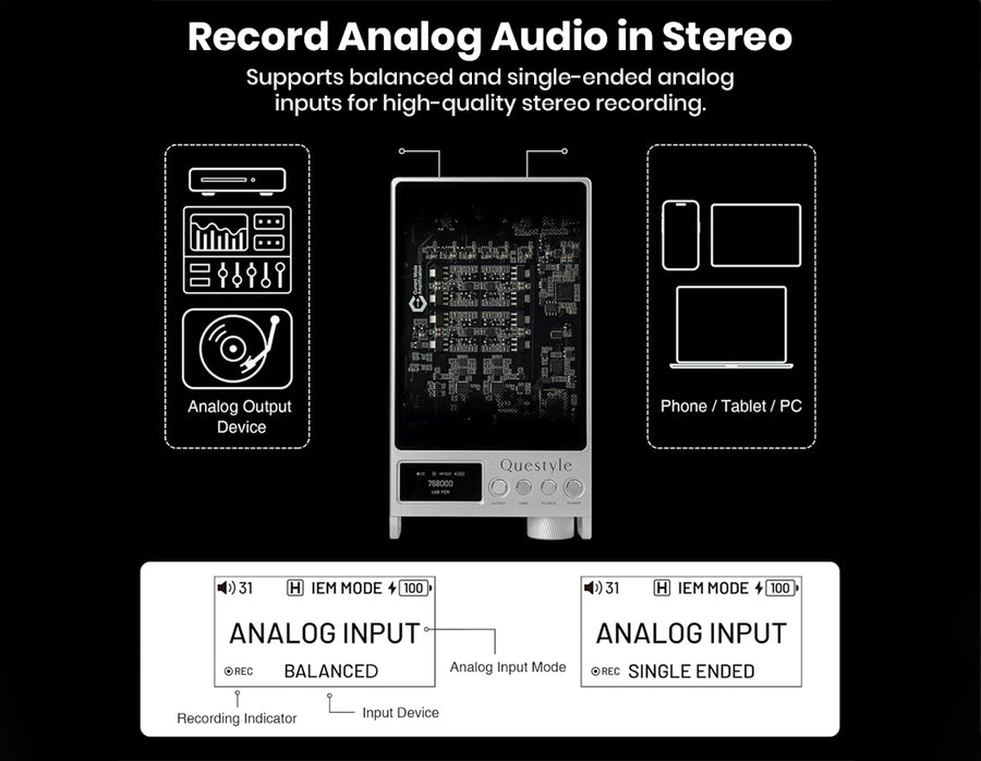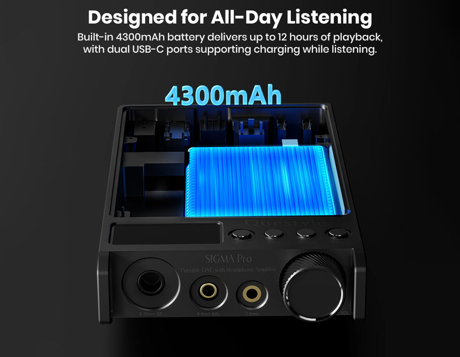 The Questyle SIGMA Pro is a flagship portable audio solution that unifies a high-resolution DAC, powerful amplifier, and advanced Bluetooth receiver in one premium device. Featuring dual-mono ESS ES9069 DACs with support up to PCM 768 kHz and DSD512, and Questyle’s patented Current Mode Amplification with TTA delivering up to 1200 mW output, it ensures low distortion with natural, balanced sound. Connectivity includes USB-C, optical, coaxial, 3.5 mm, 4.4 mm, 6.35 mm, and Bluetooth 5.4 with LDAC/aptX Adaptive. Its retro-inspired aluminum and glass design, intuitive UI, and long battery life make it a versatile flagship for audiophiles on the go.