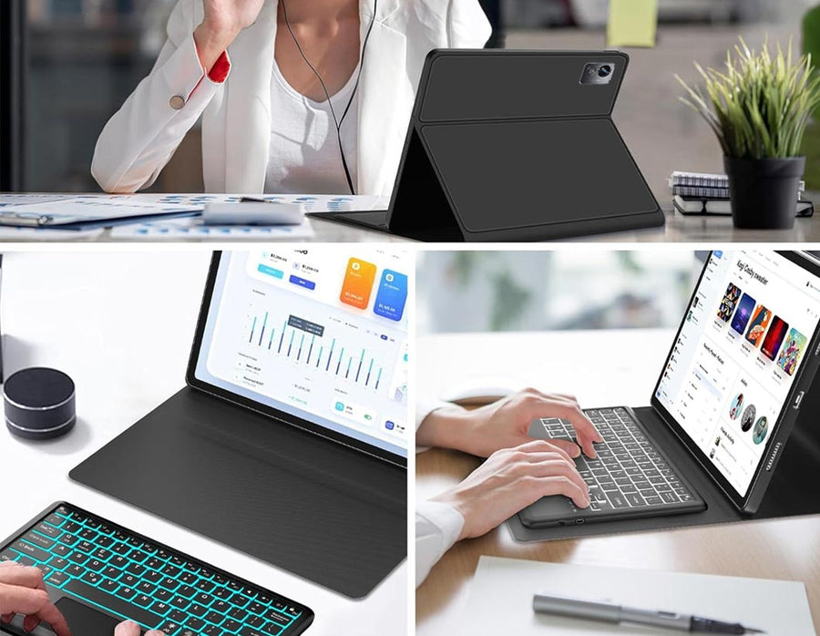 The keyboard case is only compatible with Xiaomi Redmi Pad SE 11-inch 2023 (23073RPBFG) and Xiaomi Redmi Pad 2 11-inch 2025 (25040RP0AG, 25040RP0AI). It does NOT fit other models, so please verify your tablet model number to ensure a perfect fit (Note - Tablet and pencil are not included). The protective case features a magnetic, detachable keyboard with a multi-gesture trackpad, vibrant 7-color backlit keys, and a durable battery offering up to 30 hours of use. The Keyboard Case for Redmi Pad SE trifold design allows for versatile viewing angles, while premium leather provides ultimate protection. Enjoy easy access to ports and buttons with precise cutouts, and a built-in stylus holder keeps your stylus secure. The Bluetooth keyboard for Keyboard Case for Redmi Pad SE ensures quiet, responsive typing and includes an auto sleep/wake function for energy efficiency.