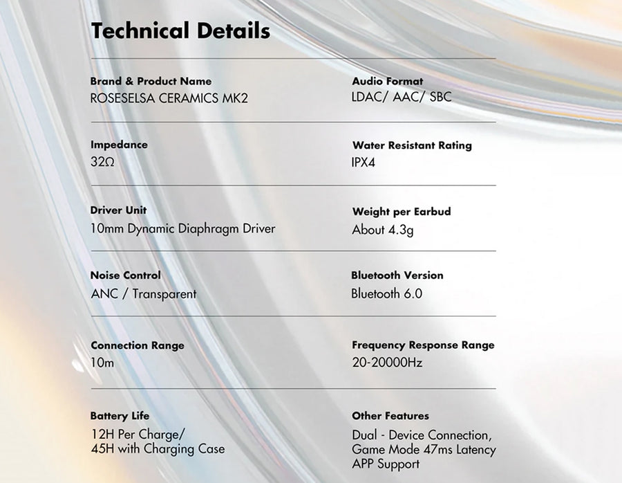Experience next-level true wireless audio with ROSESELSA CERAMICS MK2, engineered for flagship sound, powerful noise cancellation, and all-day comfort. Featuring an upgraded HR+ Planck acoustic structure with a 10mm titanium-coated diaphragm, 24-bit DAC, and 113dB SNR, it delivers deep bass, natural mids, and crystal-clear treble tuned to human hearing. The 40dB wideband ANC reduces noise with minimal ear pressure, while Hi-Res LDAC up to 990kbps ensures exceptional detail and clarity. AI-powered HD microphones provide clear calls, Bluetooth 6.0 enables seamless dual-device connectivity, and with up to 45 hours total playtime, 47ms low-latency game mode, ergonomic design, and an ad-free app, CERAMICS MK2 is built for effortless everyday performance.