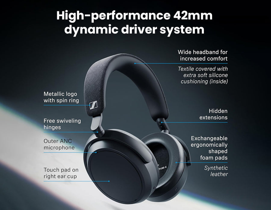 The Sennheiser Momentum 4 Wireless headphones deliver exceptional high-fidelity sound through Sennheiser’s proprietary 42mm Dynamic Drivers, producing rich bass, clear mids, and crisp highs across a wide frequency range of 6 Hz to 22 kHz. With an outstanding battery life lasting up to 60 hours on a full charge and quick-charge capabilities offering 4 hours playback with just 5 minutes of charging, these headphones are perfect for all-day use. Advanced hybrid adaptive noise cancellation dynamically adjusts to ambient sounds, complemented by a Transparency Mode that lets external sounds in when needed. Designed for comfort, they feature breathable, padded ear cups and an adjustable headband for extended wear. The Sennheiser Smart Control app offers customizable sound tuning with presets, EQ, personalized sound profiles and sound modes. This allows users to tailor audio and ANC settings based on environment and their own preference. Crystal-clear calls are also supported by four digital beamforming microphones with automatic wind noise suppression, enhancing voice pick-up and voice assistant access seamlessly.