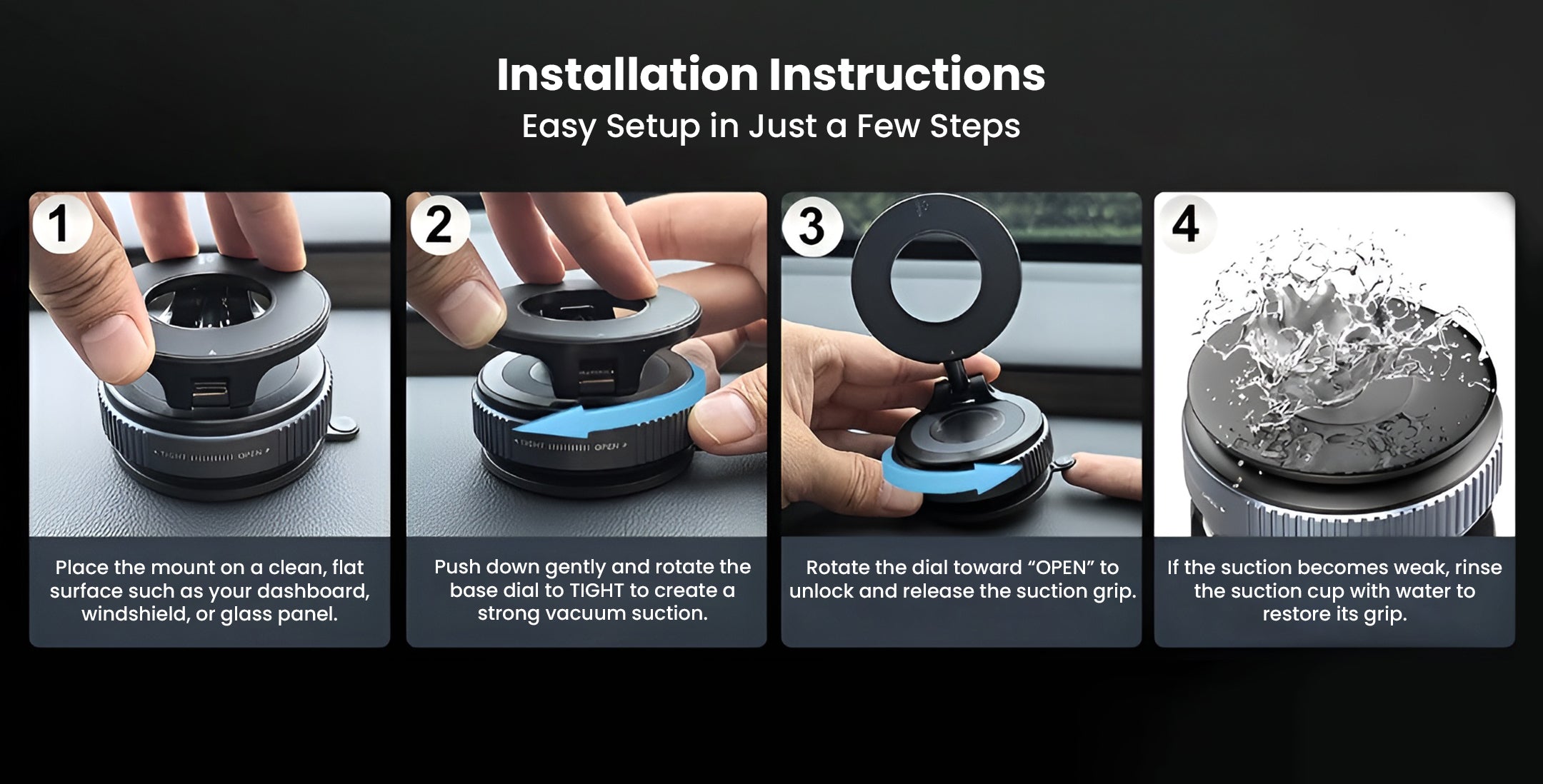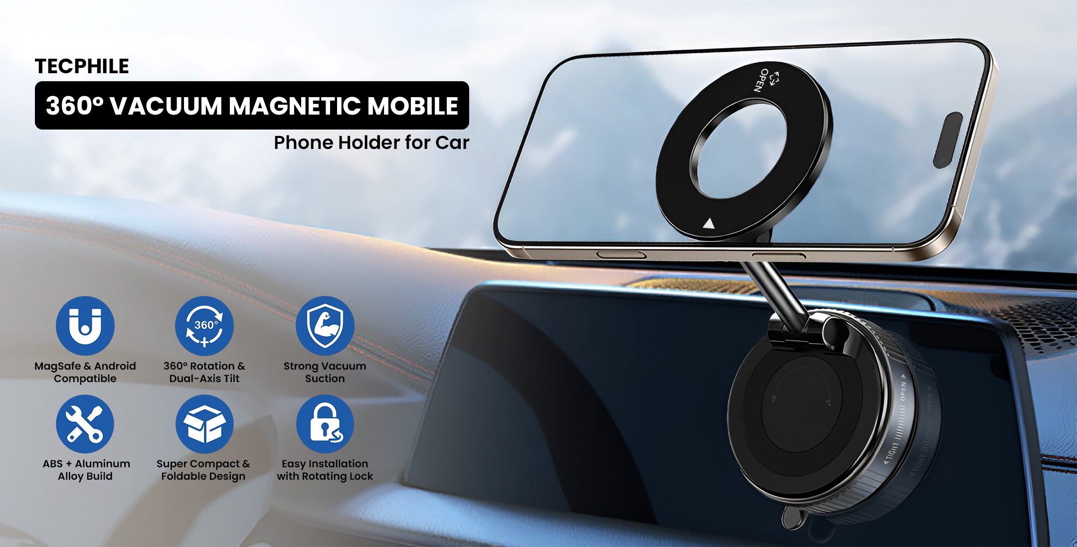 This universal magnetic phone holder for car is compatible with most iPhones (including MagSafe models) and Android phones, with a metal ring included for non-magnetic devices. The mobile phone holder for car features a powerful vacuum suction cup with a twist-lock mechanism for secure attachment to smooth or slightly textured surfaces like dashboards, windshields, mirrors, and more. The 360° adjustable design allows for quick switching between portrait and landscape modes, offering optimal viewing angles. Mobile Phone Holder for Car Built from durable ABS plastic and aluminum alloy, it’s heat-resistant, lightweight, and long-lasting. Ideal for use in cars, at home, or on the go, the mobile phone holder for cars provides a strong, hands-free solution for navigation, calls, filming, or video watching.