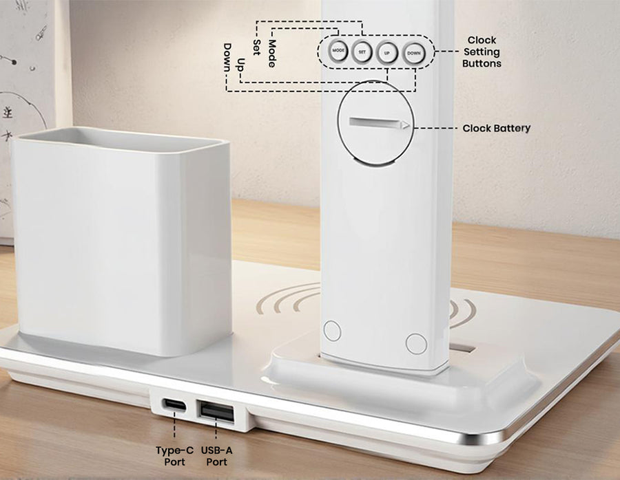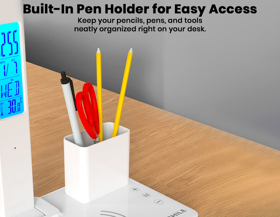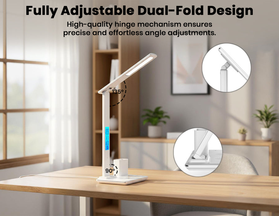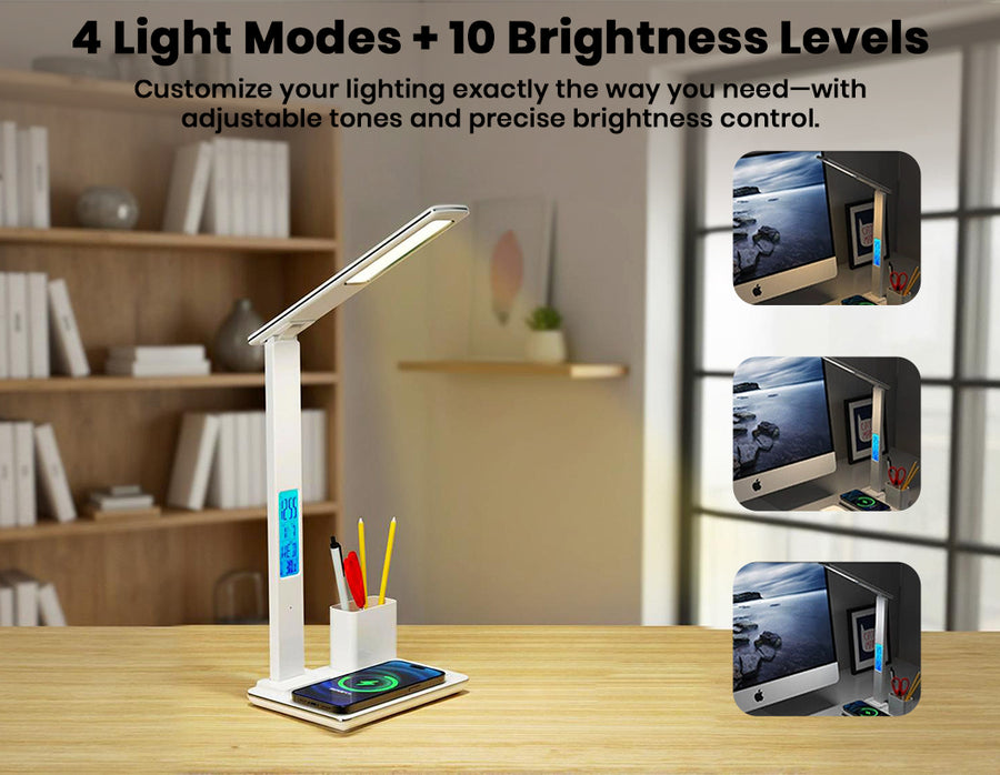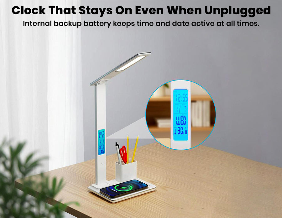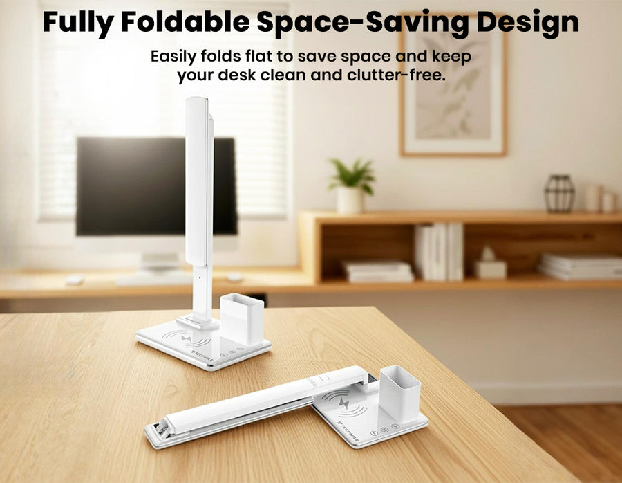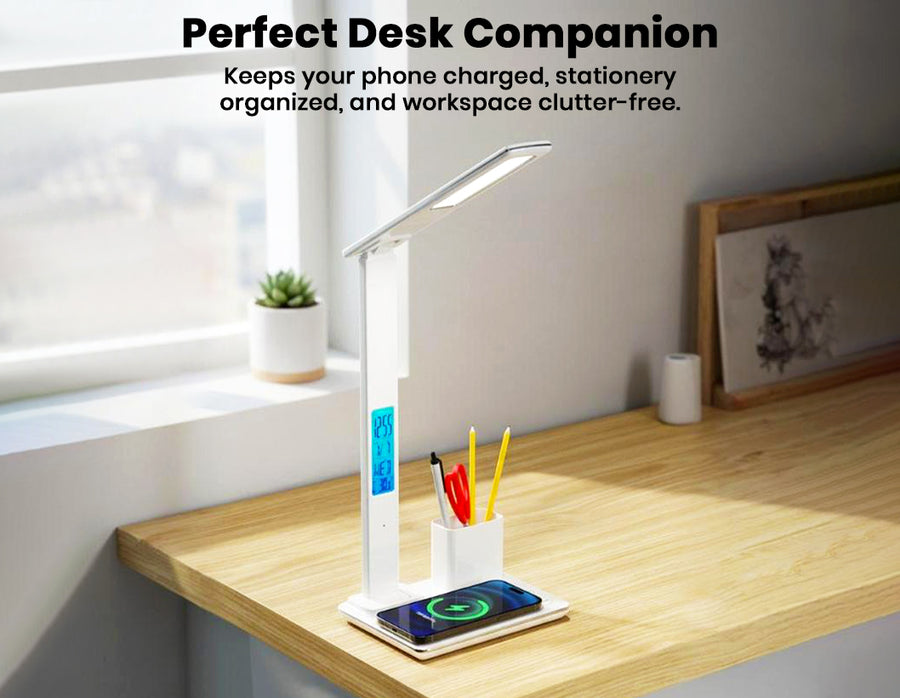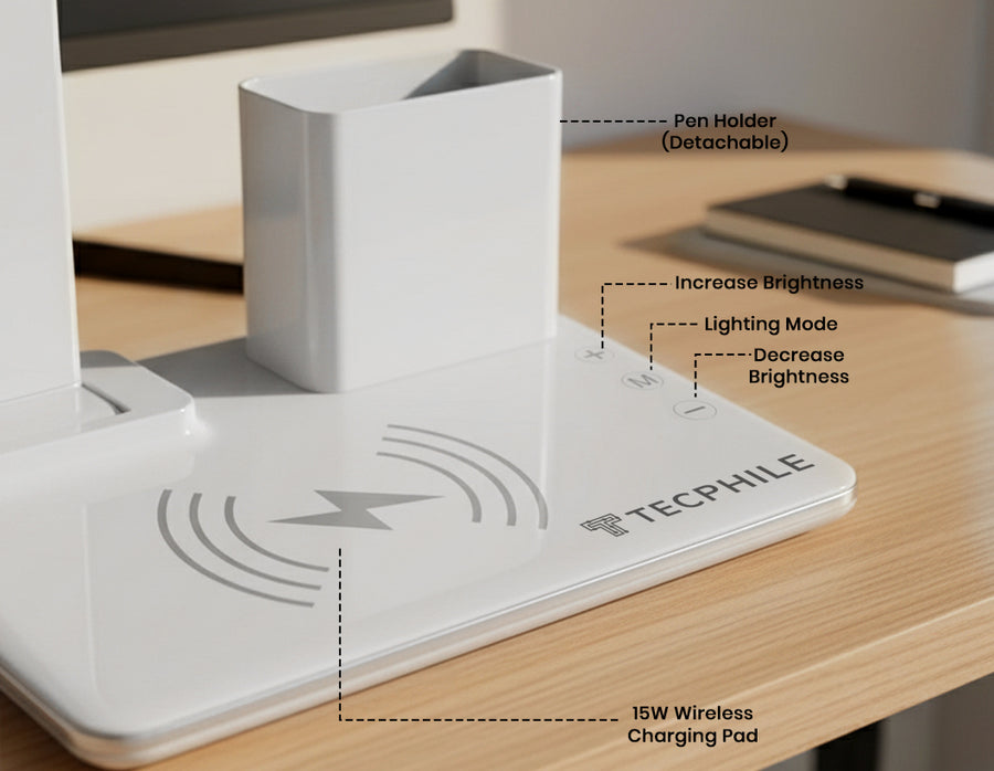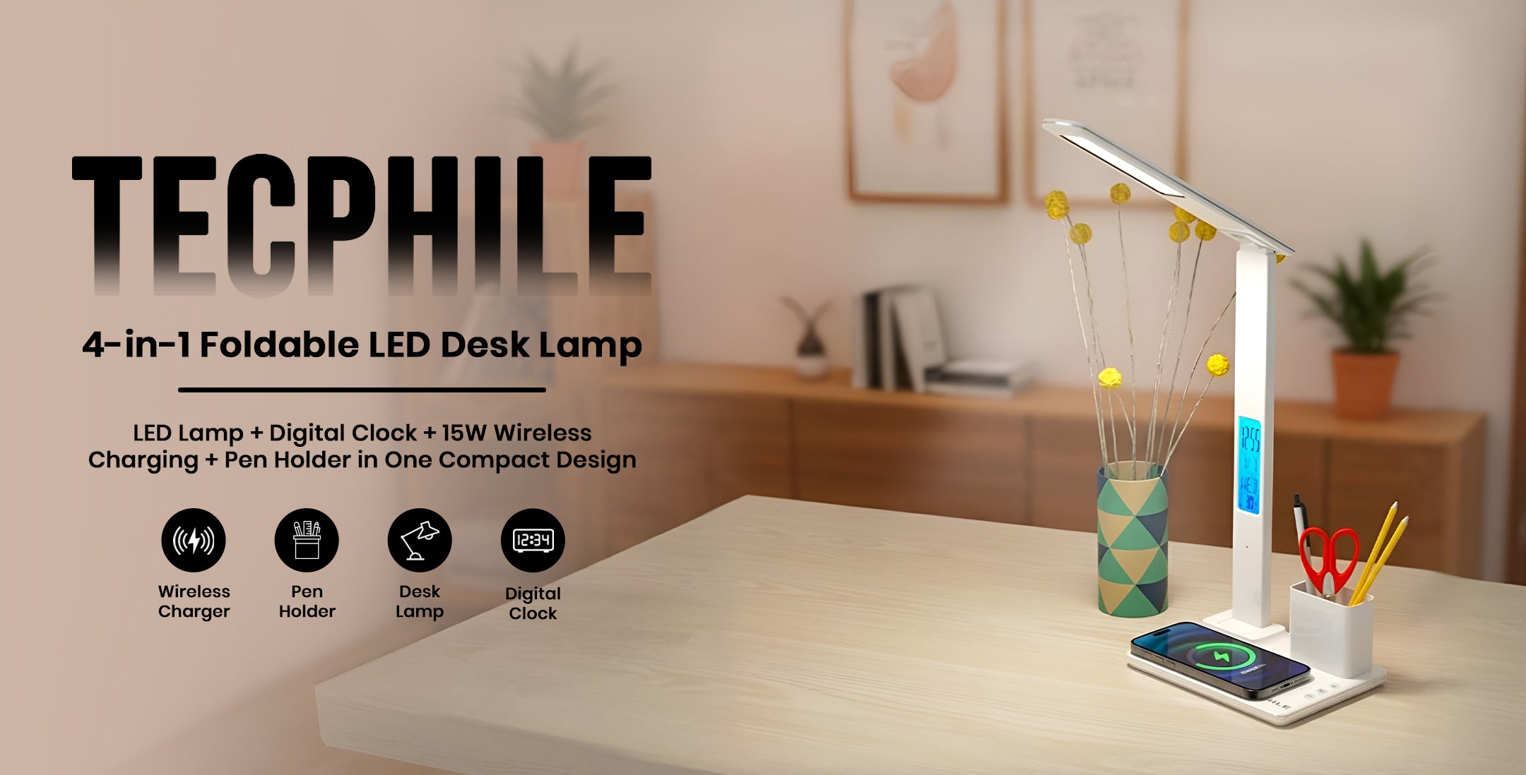 The TECPHILE 4-in-1 Smart Study Desk Lamp is a fully foldable dual-hinge LED lamp featuring Lamp + Digital Clock + 15W Qi Wireless Charger + Pen Holder in one compact design. Its main stem folds completely flat and opens to a stable 90°, while the LED arm closes fully and extends beyond 90° for wide-angle illumination. Equipped with 4 lighting modes (Warm/White) and 10 brightness levels via touch control, it delivers eye-comfortable lighting for studying, reading, and office work. The always-on digital clock shows Time, Date, Day & Temperature with an optional backlight for night use. The built-in 15W wireless fast charger powers all Qi-compatible phones, and the integrated pen holder keeps stationery organized. Ideal for students, professionals, bedside tables, home offices, and modern workspaces.