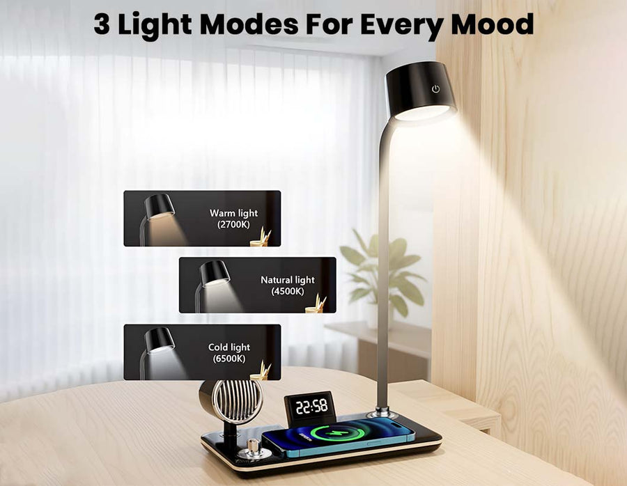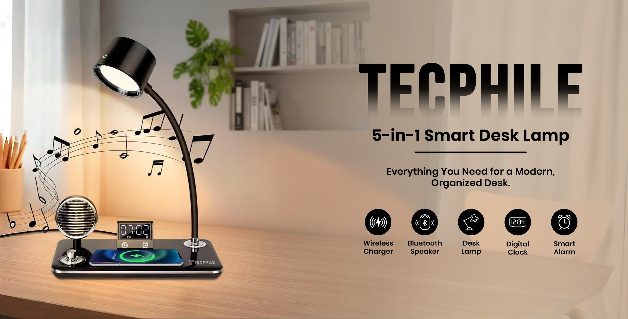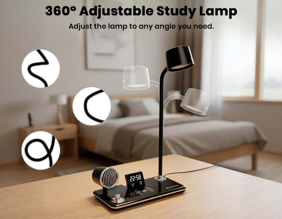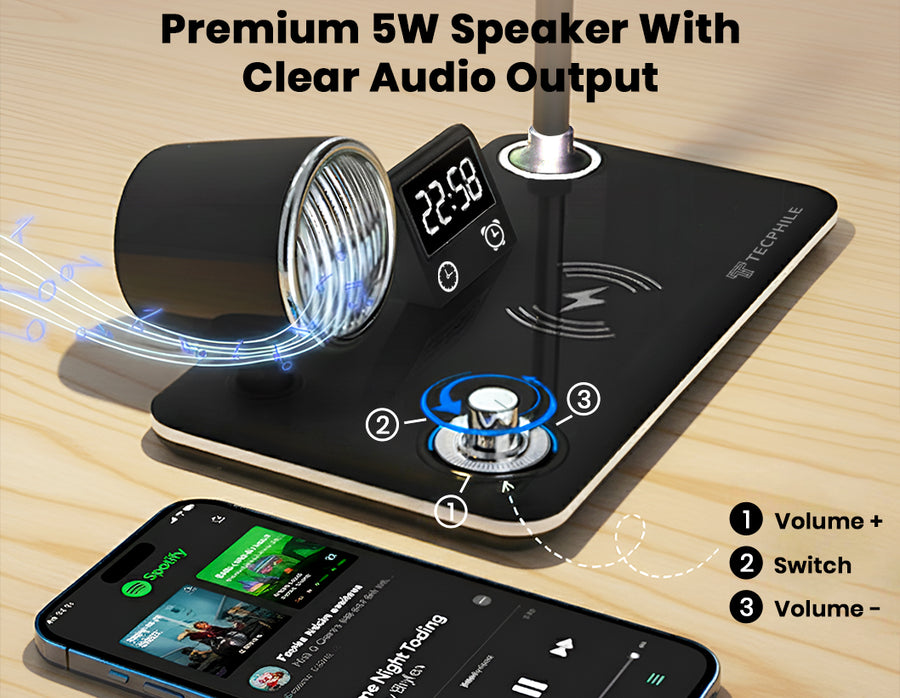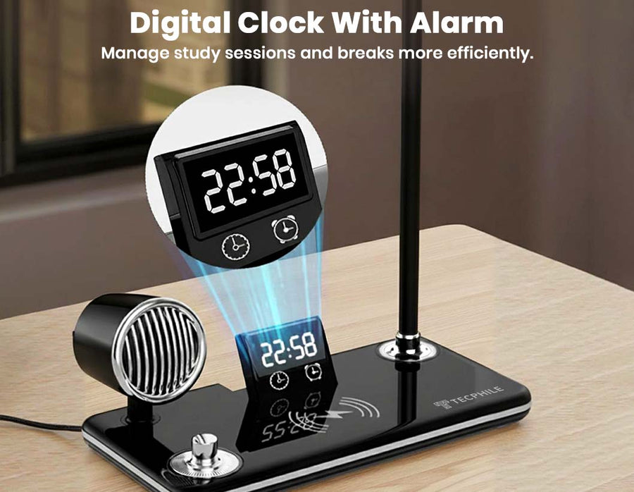 The TECPHILE 5-in-1 Study Desk Lamp combines five essential tools into one modern, space-saving accessory: an adjustable LED study lamp with 3 light modes, a built-in 5W Bluetooth speaker, a digital LED time display with alarm & snooze, a fast 15W wireless charger, and a flexible hose for perfect lighting angles. Designed for students, home offices, bedside tables, and study rooms, it keeps your desk organised, reduces clutter, and enhances productivity with smooth touch controls and premium build quality.