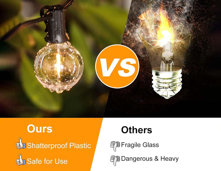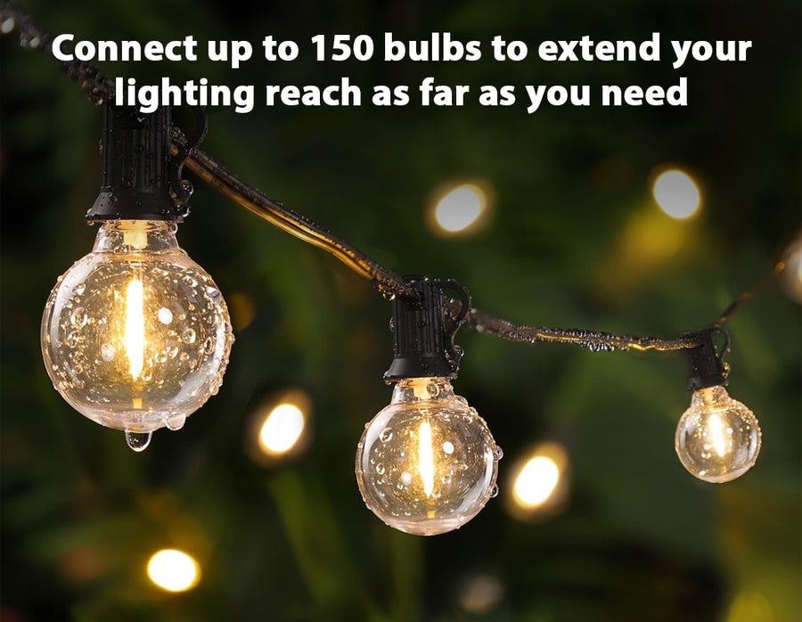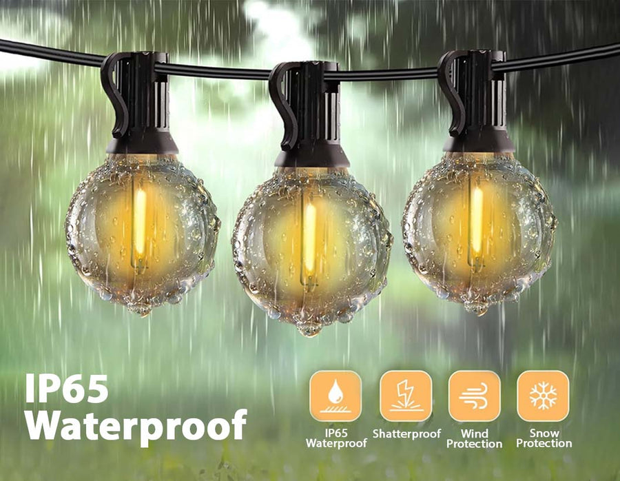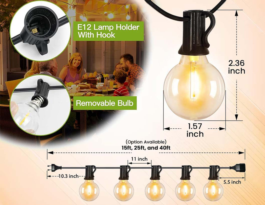 These G40 decorative string lights Available in 15ft, 25ft, and 40ft lengths to suit various spaces, feature 0.6W energy-saving LED bulbs, reducing electricity use by 80%. Made from shatterproof premium plastic with commercial-grade copper and PVC wiring, they are sturdy and weather-resistant. With an IP65 waterproof rating, they withstand rain, wind, and extreme temperatures for reliable indoor and outdoor use. waterproof outdoor string lights has built-in hook allows for easy installation and storage. The warm, romantic glow enhances any space, from patios to living rooms. Plus, the end-to-end connection supports up to 150 bulbs, waterproof outdoor string lights making them ideal for larger areas.