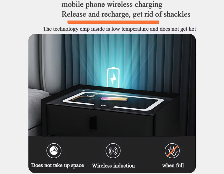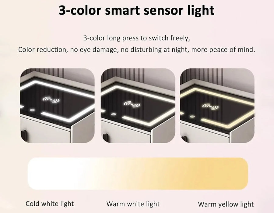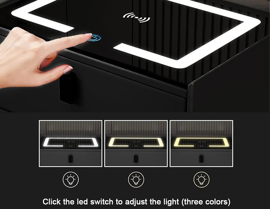 This bedside table features adjustable LED lighting in cool white, natural, and warm yellow, controlled by touch. Bedside chest includes a 15W wireless charging station, USB charging port, and two sockets (10W USB and 10W Type C). The built-in 5W Bluetooth speaker provides high-quality audio. Made from durable MDF board with a sleek finish, it comes in two colors and can function as a desk, nightstand, or coffee table. Perfect for any room, it combines style and functionality seamlessly.