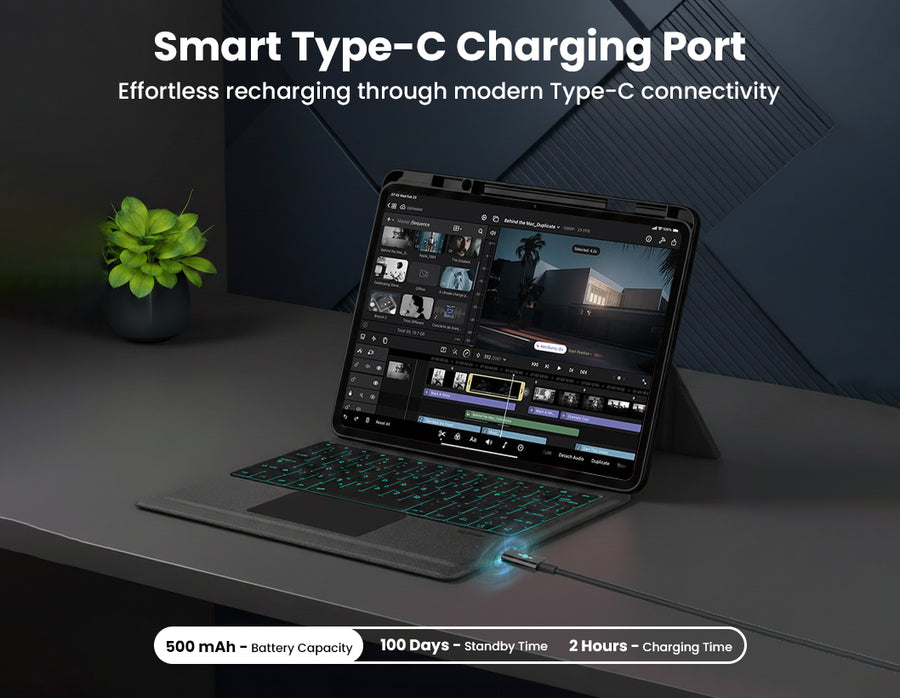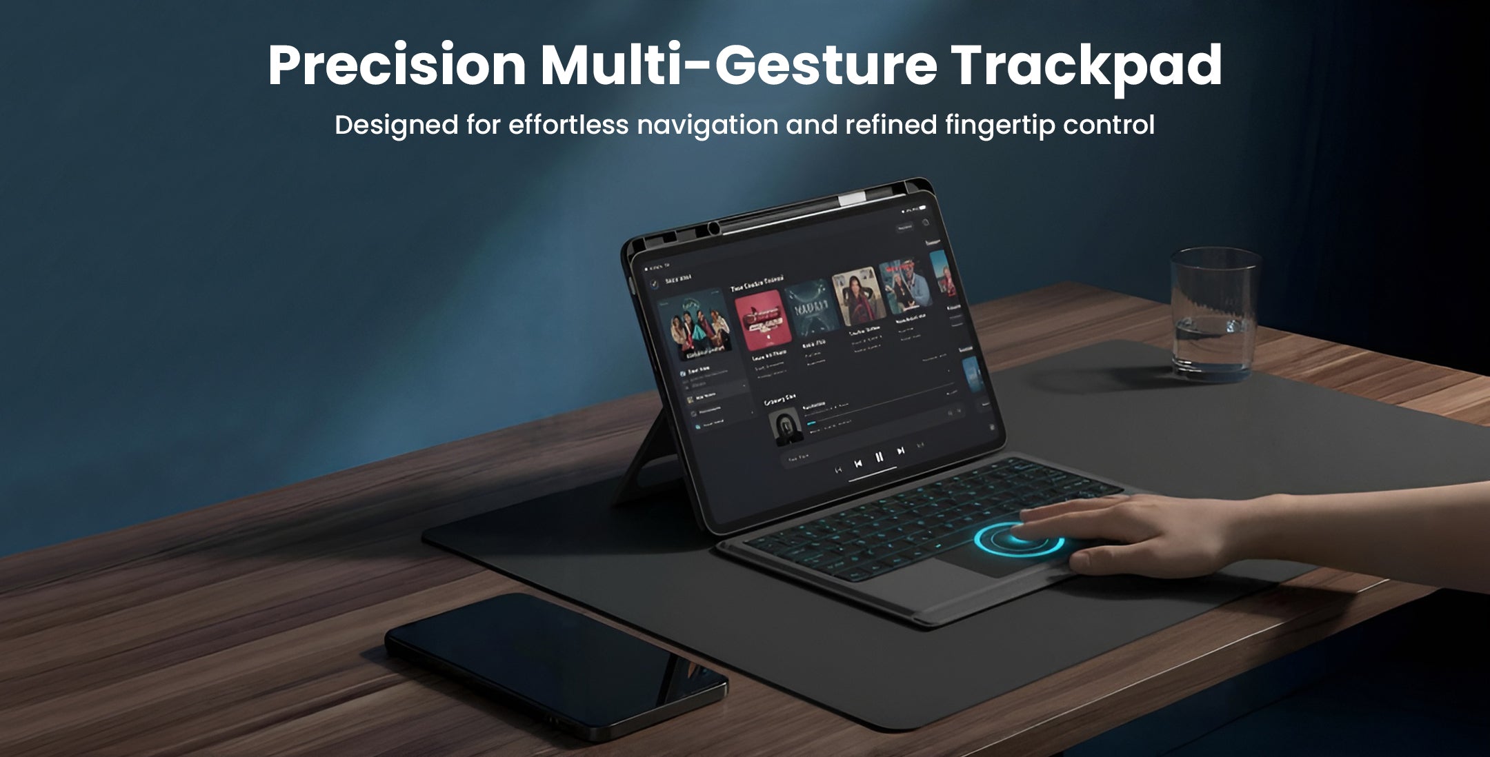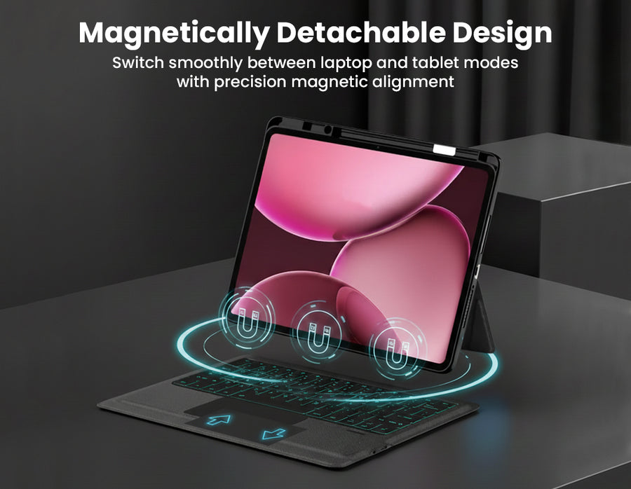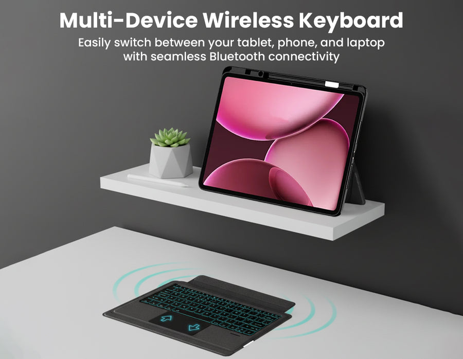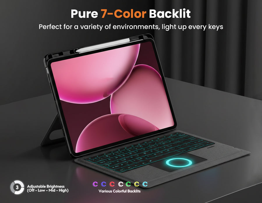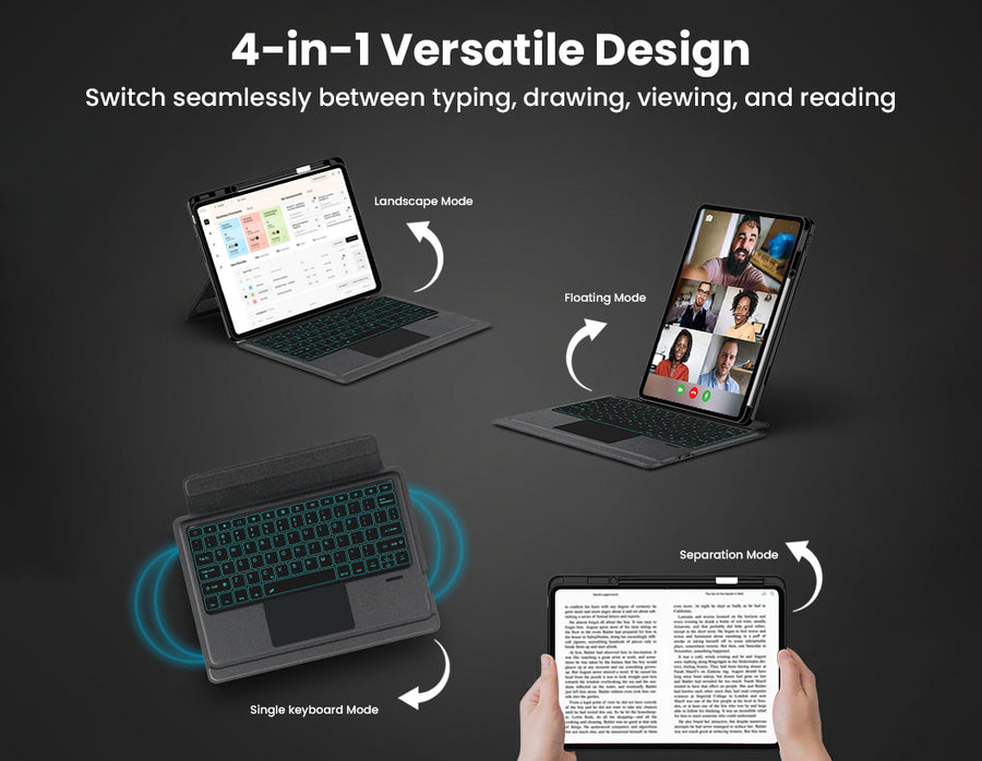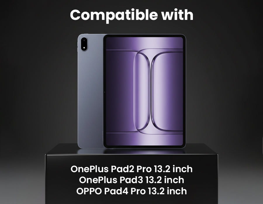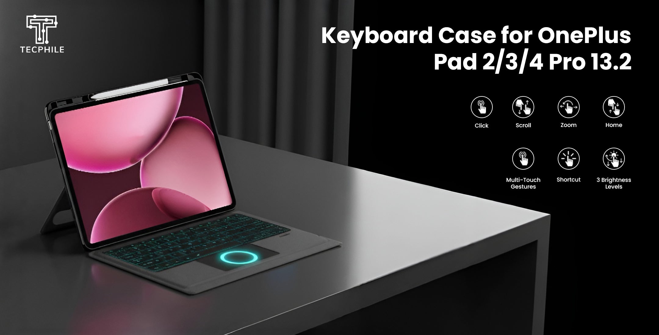 The Tecphile YJ-OP132 keyboard case fits only OnePlus Pad 2/3/4 Pro 13.2-inch models—check your tablet before buying (no tablet included). This magnetic folio with detachable keyboard offers a multi-gesture trackpad, 3-gear colorful backlit 1.3mm scissor keys, and Bluetooth up to 10m for responsive typing. PU leather, microfiber interior, PC shell, raised edges, and pen holder provide slim protection against drops and scratches. 4-mode kickstand (laptop/tablet/viewing/handheld) supports multi-angle use for work or entertainment. 150-500mAh battery gives 60+ hours use, 100-day standby, and 2-3 hour Type-C charging.