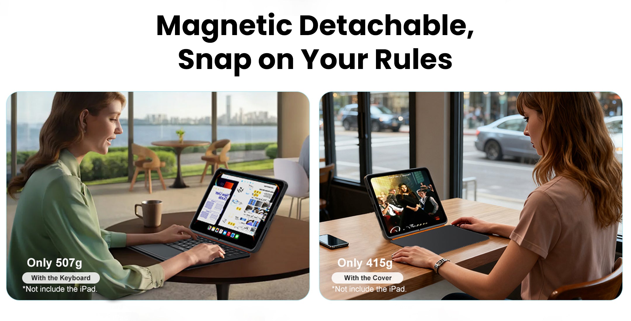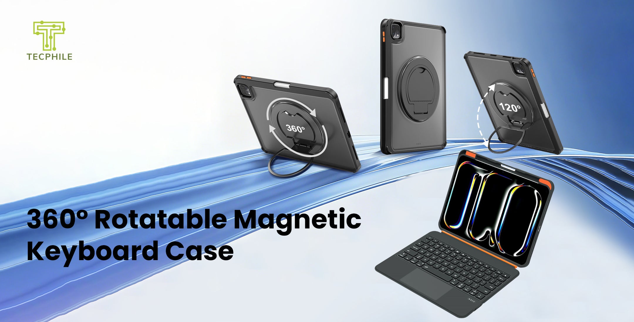 Experience next-level convenience with the TECPHILE TU3607 360° Rotating Magnetic Keyboard Case, designed exclusively for iPad models, including iPad 11-inch A16 (2025), iPad Air M3/M2 and iPad Pro 11" (1st–4th Gen). Crafted with a strong shockproof satin acrylic back, this case resists fingerprints, cracks, and bending, ensuring long-lasting clarity and protection. The aluminum alloy shaft maintains durability even with frequent rotation.