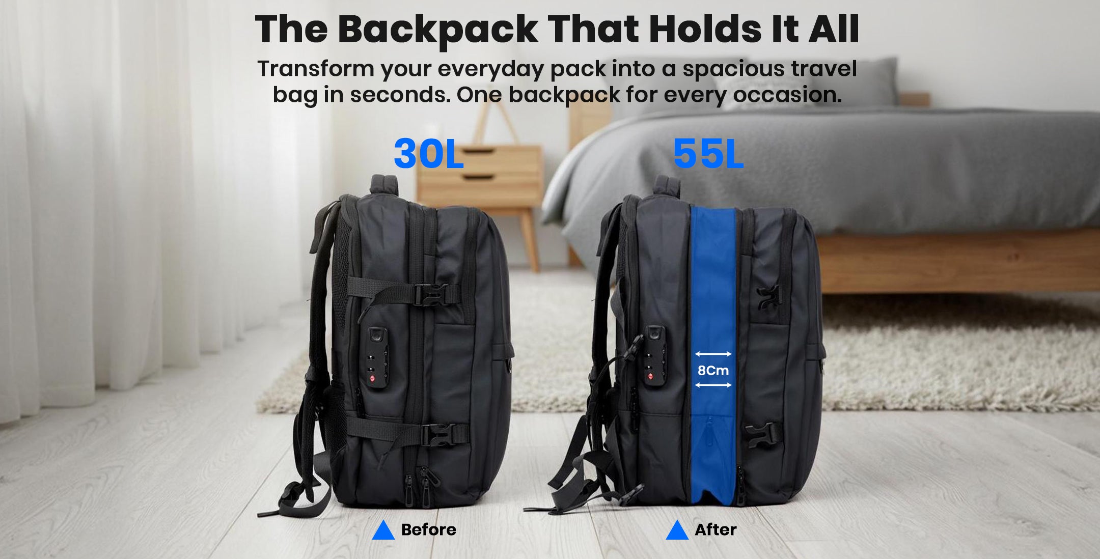 Experience the ultimate travel upgrade with this 30L–55L expandable vacuum compression backpack featuring a built-in air-suction vacuum system, wet/dry waterproof compartment, 17.3" padded laptop pocket, 180° suitcase-style opening, USB charging port, anti-theft pocket, luggage strap, compression stabilizer straps, and breathable air-mesh back support. Designed for maximum space saving and organization, it includes an dedicated vacuum compartment, multi-layer storage, ergonomic shoulder straps, and comes with a USB-C rechargeable Multi-purpose vacuum pump with 2 nozzles—making it the most complete vacuum compression travel backpack for flights, business trips, commuting, gym use, and long journeys.